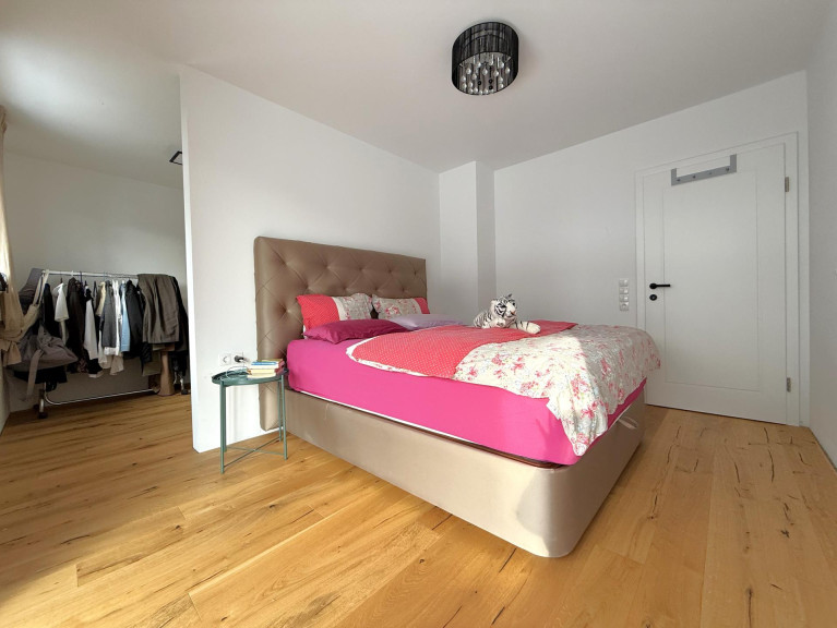 Das Obergeschoss ist der private Rückzugsbereich der Familie. Drei Schlafzimmer bieten ausreichend Platz für Eltern und Kinder. Das Elternschlafzimmer verfügt über einen praktischen Schrankraum sowie Zugang zum Balkon (ca. 7,88 m²). Das großzügige Badezimmer sorgt für entspannte Morgen- und Abendroutinen. Besonders alltagstauglich ist der Wäscheschacht, der direkt in den Waschraum führt.