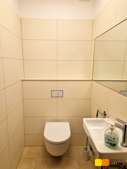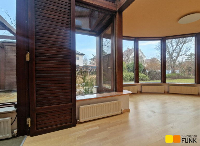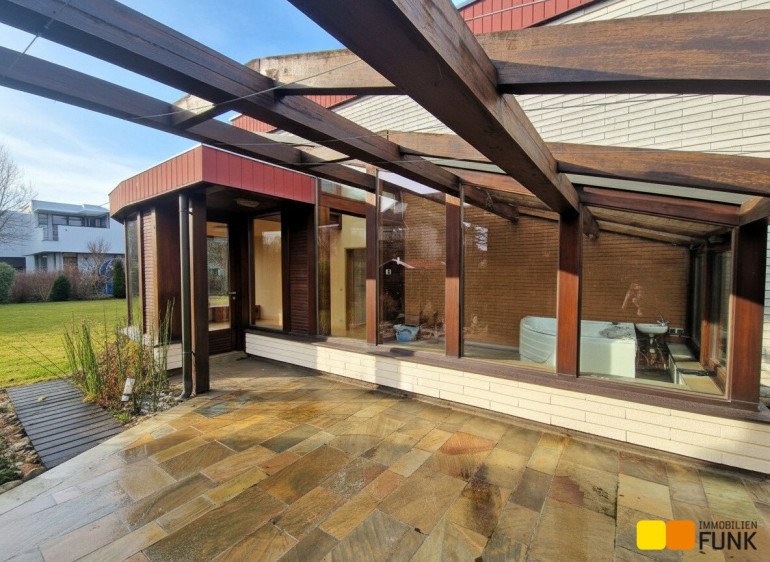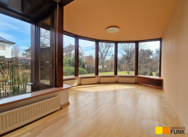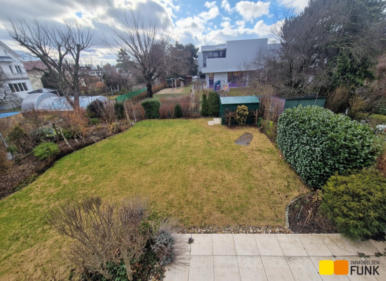 Sie betreten diese überaus attraktive Immobilie über den Vorgarten und den offenen Vorraumbereich, der ausreichend Platz für die Garderobe bietet. Rechter Hand stehen der Haustechnikraum, ein WC mit Handwaschbecken sowie zwei große Abstellräume und eine zusätzliche, begehbare Garderobe zur Verfügung. Das restliche Erdgeschoss verwöhnt mit seiner offenen Grundrissgestaltung: auf etwa 73 m² präsentiert sich ein -durch die großen Fensterflächen- überaus heller Lebensraum mit Küche, Wohnzimmer und Wintergarten. Dieser Bereich öffnet sich zum ebenen und liebevoll gestalteten Garten. Sowohl aus dem Wohnbereich als auch aus dem Wintergarten betreten Sie jeweils auf eine große Terrasse. Jene vor dem Wohnzimmer verfügt zusätzlich über eine neue Markise.