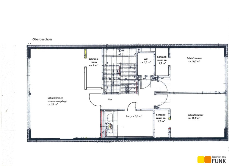 - Obergeschoss: ca. 62 m² (Flur, 3 Schlafzimmer mit je einem begehbaren Schrank, WC, Badezimmer)