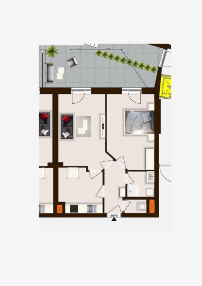 Der Flur bietet genügend Platz für die Garderobe und übernimmt die Rolle des zentralen Verteilers, von dem aus alle Räume separat begehbar sind. Besonders hervorzuheben ist die vom Wohnraum getrennte Küche mit Platz für den eigenen Essbereich. Als weiteres Highlight darf die großzügige Terrasse bezeichnet werden, welche sowohl vom Wohn- als auch vom Schlafzimmer begehbar ist.