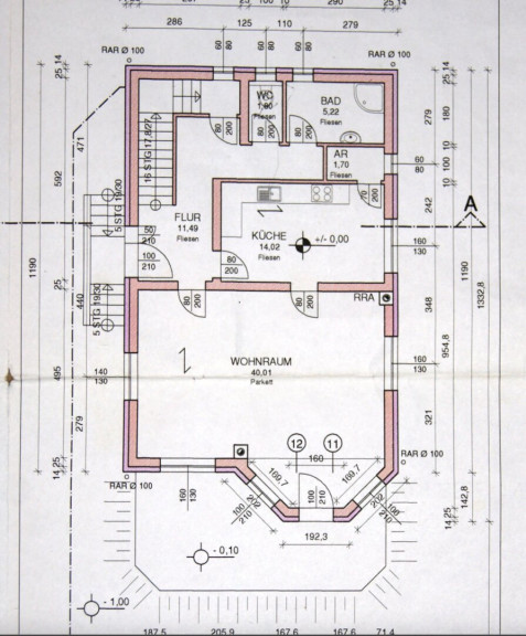 - ein 40 m2 großes Wohnzimmer mit Ausgang zur zirka 22 m2 großen Terrasse und zum Garten