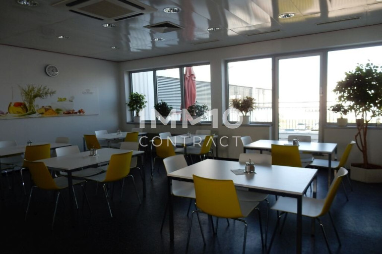 Verbindung: EG + OG mit Aufenthaltsraum, Kantine und Terrasse.