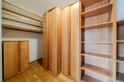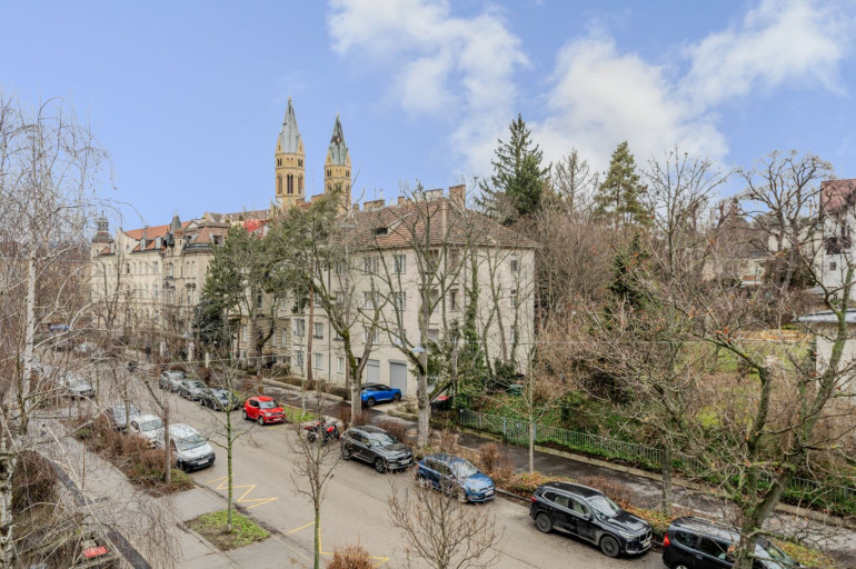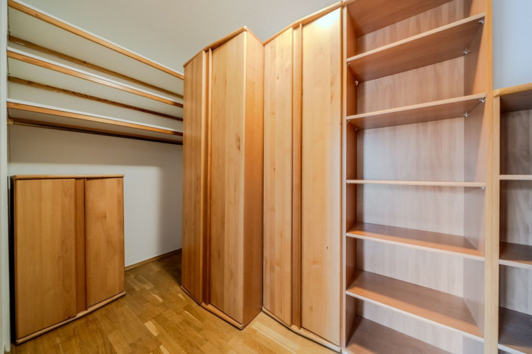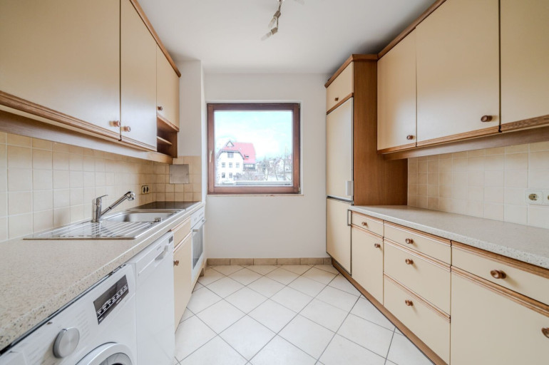 Die separate Küche mit Fenster bietet Tageslicht und einen schönen Ausblick. Das ruhig gelegene Schlafzimmer wird durch einen großzügigen begehbaren Schrankraum ergänzt, der außergewöhnlich viel Stauraum schafft. Badezimmer und WC sind getrennt und sorgen für zusätzlichen Komfort im Alltag. Der Holzboden verleiht der Wohnung eine warme, wohnliche Note.