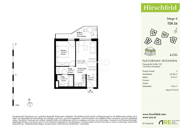 Naturnah und gut angebunden Hirschfeld ist ein beschauliches Viertel am Wiener Stadtrand. Die Metropole im Rücken verheißt jedem Nachhausekommen ein Naturerlebnis und Entspannung. Wer gerne mit den Wiener Linien unterwegs ist, nimmt am besten die Autobuslinie 32A ab Kollarzgasse bis zum U- und S-Bahn-Knotenpunkt Leopoldau. Von hier aus ermöglichen die U1 in Richtung Zentrum sowie die Schnellbahnlinien S1, S2 und S7 eine rasche Verbindung stadtein- und stadtauswärts. Alternativ verläuft die Straßenbahnlinie 31 entlang der Brünner Straße über Floridsdorf direkt bis Schottenring. Autofahrer profitieren von der nahegelegenen A22.Beschreibung der Immobilie
