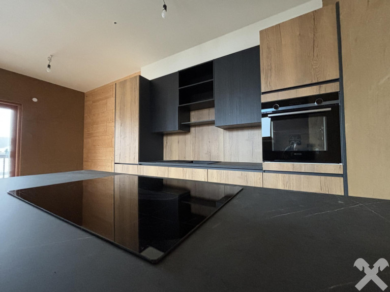 Der offene Wohn-, Ess- und Kochbereich ist dank großer Holzfenster und Hebe-Schiebetür lichtdurchflutet und führt auf eine großzügige Lärchenholz-Terrasse.