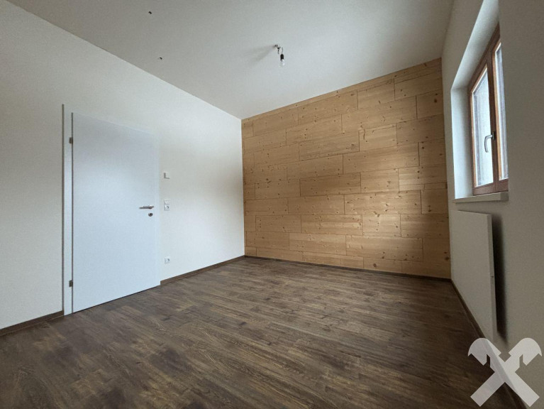 Das Schlafzimmer bietet ausreichend Platz für individuelle Gestaltung. Im Badezimmer sind alle Installationen vorbereitet – Fliesen und Sanitärgeräte können noch nach persönlichen Vorstellungen gewählt werden.