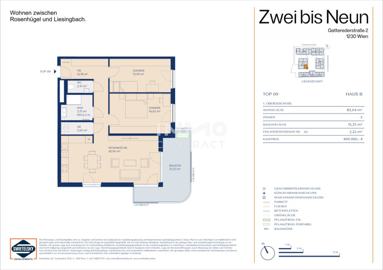 Die Lage des Projekts bietet das Beste aus beiden Welten: Die lebendige Stadt ist nur einen Katzensprung entfernt, während die umliegenden Grünflächen und der Liesingbach zum Durchatmen und Entspannen einladen. Zahlreiche Nahversorger wie Supermärkte, Drogerien und Apotheken befinden sich nur wenige Schritte entfernt, und auch ein Kindergarten liegt in unmittelbarer Nähe. Für kulinarische Genüsse sorgen namhafte Weingüter, Heurige und Gasthäuser während das Einkaufszentrum Riverside eine Vielzahl an Einkaufs- und Freizeitmöglichkeiten bietet. Sport- und Naturbegeisterte finden im Liesingbachgebiet und im neu geschaffenen Stadtpark Atzgersdorf ideale Orte für Spaziergänge, Laufrunden und Erholung. Selbst das beliebte Liesinger Bad ist mit dem Fahrrad in weniger als zehn Minuten erreichbar. Der nahegelegene Autobus bringt Sie in nur 13 Minuten nach Hietzing, und der Schnellbahn-Bahnhof Atzgersdorf ist lediglich eine kurze Spazierstrecke oder eine zweiminütige Busfahrt entfernt. Von dort aus erreichen Sie die zentralen Verkehrsknotenpunkte Wien Meidling und Wien Hauptbahnhof in nur sechs bzw. zwölf Minuten. Diese gute Anbindung macht das Projekt zur idealen Basis für ein urbanes Leben im Grünen – auch ohne eigenem Auto!Beschreibung der Immobilie