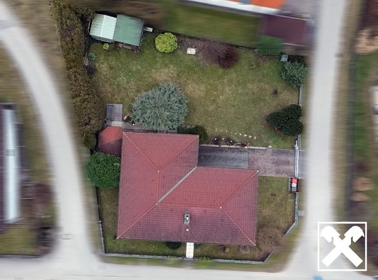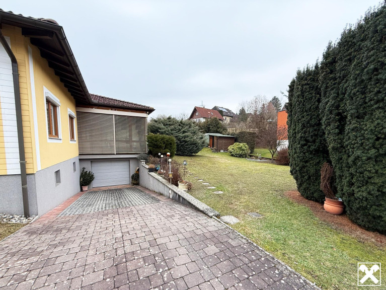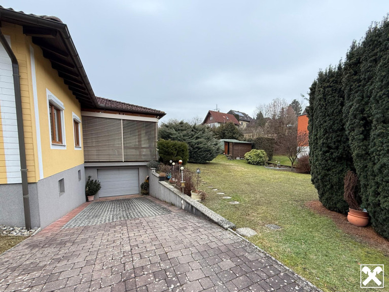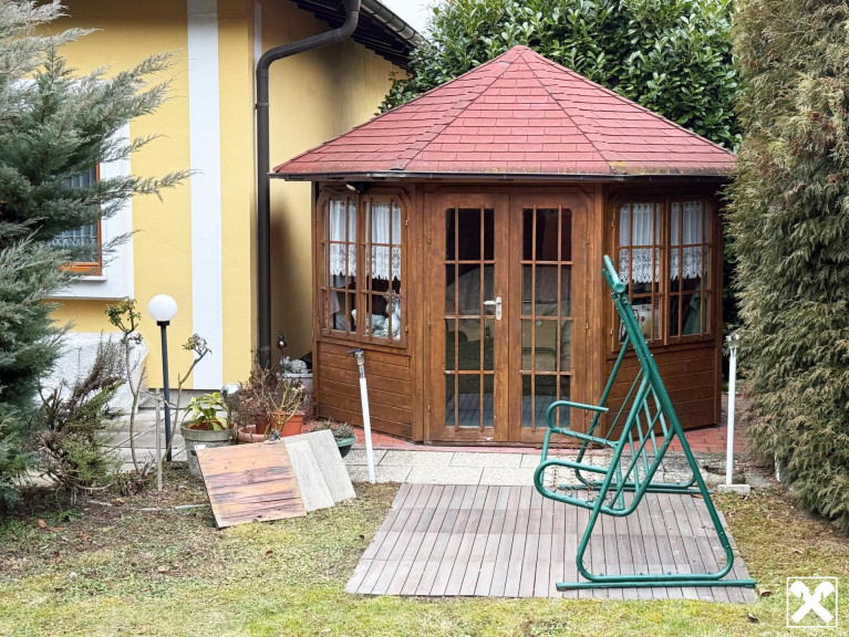 Sehr nett ist auch der Garten gestaltet. Dieser beinhaltet neben einer Garten-/Holzlagerhütte auch einen Holzpavillon, viel Platz , die gepflasterte Zufahrt zur Garage mit hochwertigem Schiebetor, und einen attraktive Einfriedung!