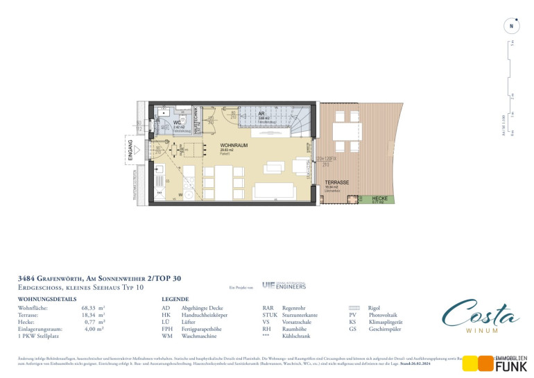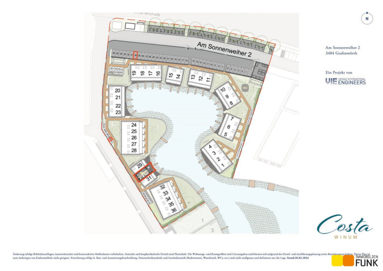 Sich den Traum vom Haus am See erfüllen und 365 Tage Urlaubsfeeling genießen. Das ist möglich im Sonnenweiher Grafenwörth, ca. 30 Fahrminuten von der Stadtgrenze Wiens entfernt, im Herzen der Region Wagram zwischen Wien und der Wachau. Ein nachhaltiges, gut durchdachtes Gesamtkonzept, erstklassige Architektur, hochwertige Ausstattung und viel Grünraum fördern das besondere Lebensgefühl am Sonnenweiher. Die Verkehrsanbindung Richtung Wien und Krems (S5, Stockerauer Schnellstraße) sowie nach St. Pölten (S33) ist ausgezeichnet. In der Gemeinde Grafenwörth gibt es ausreichend Einkaufsmöglichkeiten für Güter des täglichen Bedarfs, Kinderbetreuungseinrichtungen und Schulen. In diesem wunderbaren, regionalen Umfeld eingebettet, entstehen an einem mäanderförmig angelegten, ca. 36.000 m² großen See in mehreren Bauabschnitten insges. 170 Wohnimmobilien in Form von Einfamilien-, Doppel- u. Reihenhäusern im Eigentum sowie 36 kleine Seehäuser im Wohnungseigentum.