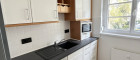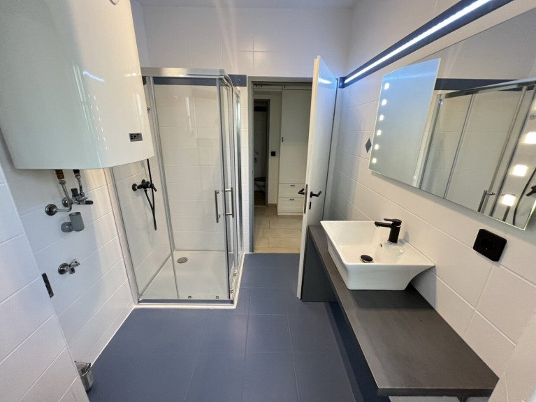Ein modernes Badezimmer mit Fenster, Dusche und ausreichend Stauraum sorgt für Komfort und Funktionalität. Die natürliche Lichtquelle schafft eine angenehme Atmosphäre, während Sie sich für den Tag vorbereiten.