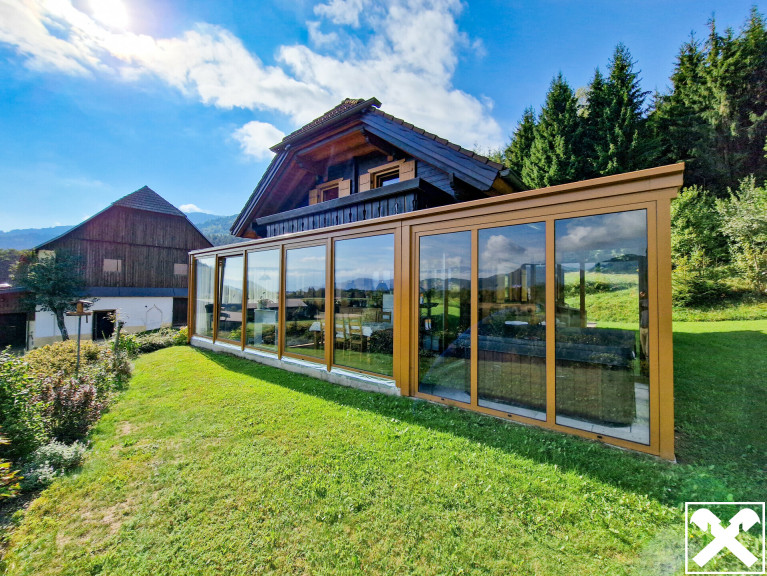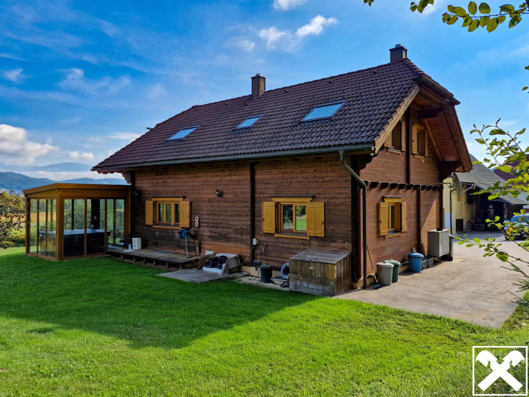 Mehrere Objekte gehören zu dieser beeindruckenden Liegenschaft: Dazu zählt ein besonders schönes Landhaus in Holzbauweise der Firma Rubner, ausgestattet mit einer Luftwärmepumpe, einem Holzvergaserkessel der Firma Guntamatic, einem außerordentlich romantischen Kamin, einem hellen Wintergarten und einem Jacuzzi.