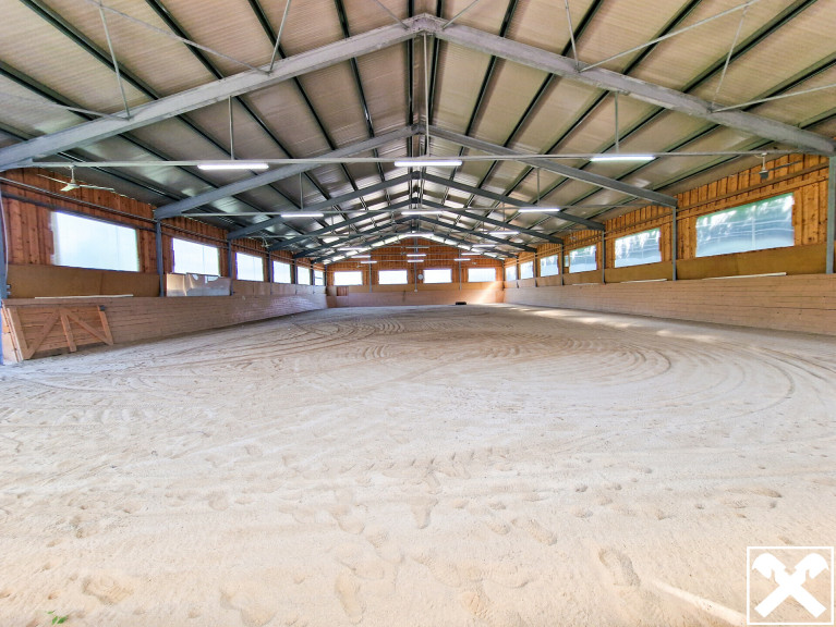 mit Deckenventilatoren samt großzügigem Reitaußengelände sowie einem Round-Pen.