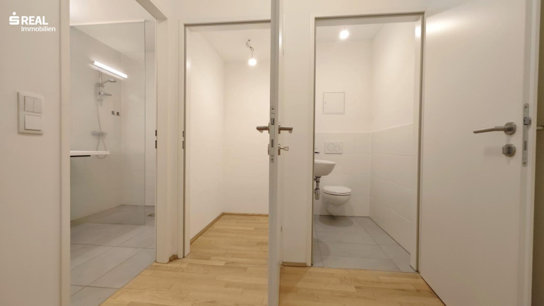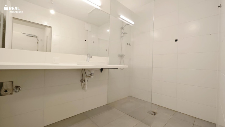 Badezimmer mit Dusche und Waschmaschinenanschluss