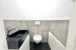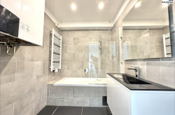 hochwertiges Badezimmer mit Verfliesung, Badespiegel, Badewanne und Handtuchradiator