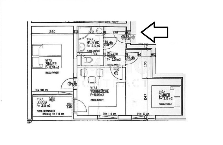 Raumaufteilung: Vorraum, Ess-Küche, Wohnzimmer, Schlafzimmer, Badezimmer/Toilette, Kellerabteil, LOGGIA.