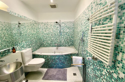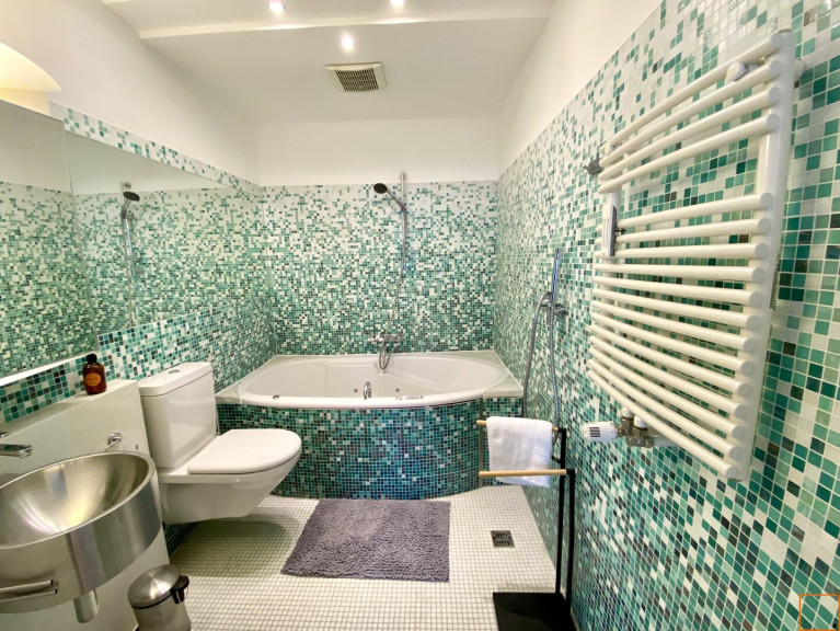 - en suite Badezimmer mit hochwertigen Mosaikfliesen, Wanne mit Whirlpoolfunktion, Toilette