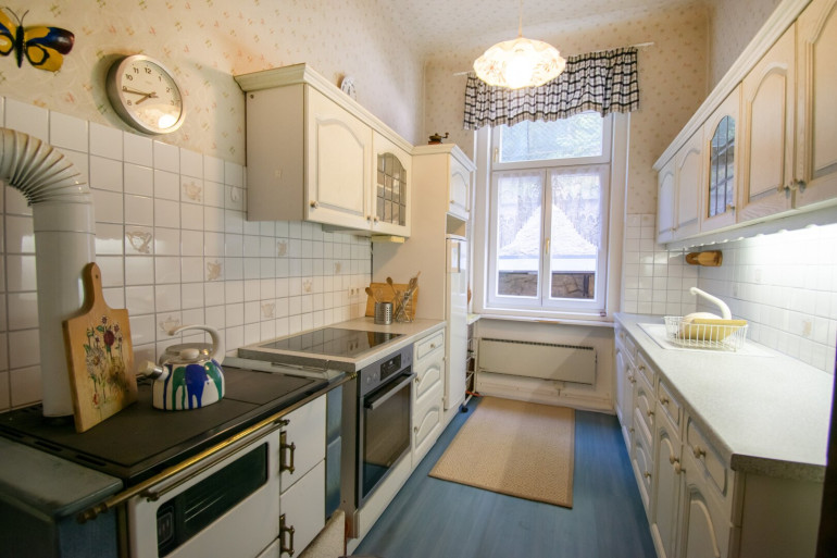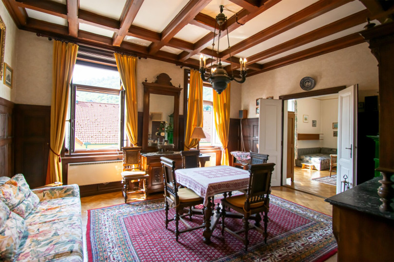 Der ostseitige Eingang führt in eine helle Veranda und weiter in den großzügigen Wohnbereich mit Speisesalon, Schlafzimmer, Küche, Bad/WC sowie einer ehemaligen Dienstbotenwohnung.