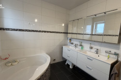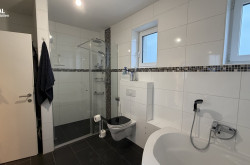 - Badezimmer mit Walk-in-Dusche, Eckbadewanne, Doppelwaschtisch und WC