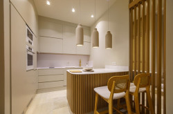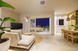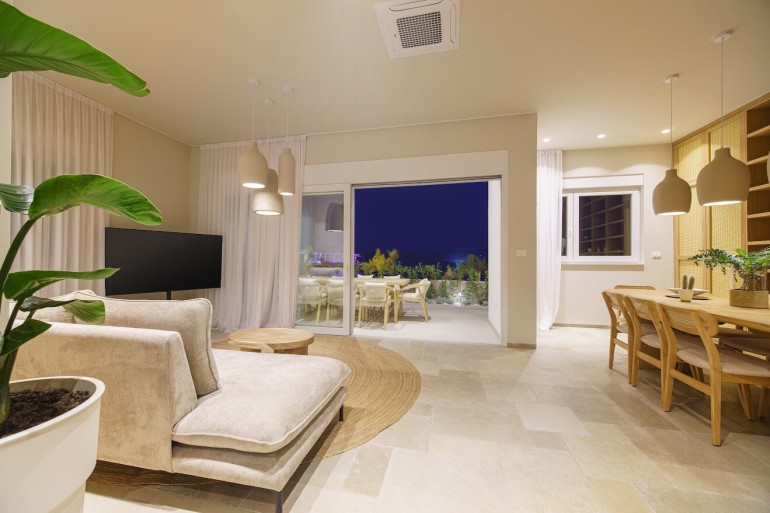 Das Wohnzimmer besticht durch viele technische Feinheiten und ist nicht nur modern, sondern auch sehr gemütlich. Auf der rechten Seite befindet sich ein großer Esstisch und dahinter die geschmackvolle Küche, die selbstverständlich mit allen nötigen Geräten ausgestattet ist, die man für modernes Kochen benötigt. Im linken Teil des Wohnzimmers befindet sich eine gemütliche Sitzgarnitur, die nicht nur zum Chillen einlädt, sondern auch einen herrlichen Blick auf das Meer bietet.