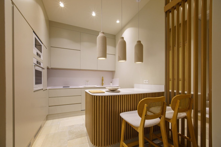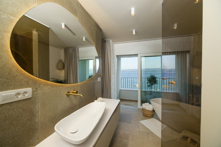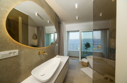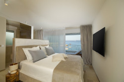 Im ersten Stock befinden sich zwei Schlafzimmer und ein Aufenthaltsraum, der auch mit einer kleinen Küche ausgestattet ist. Beide Schlafzimmer verfügen über ein eigenes Bad und einen Balkon. Natürlich schauen Sie auch hier auf das Meer.