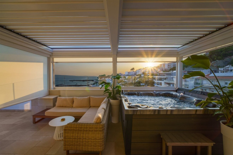 Im zweiten Stock befindet sich ein weiteres Schlafzimmer und eine Terrasse mit Jacuzzi und uneingeschränktem Blick auf die gesamte Bucht.