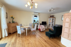 Die Raumproportionen ermöglichen sowohl repräsentatives Wohnen als auch gemütliche Rückzugssituationen. Die separate Küche ist funktional angeordnet und bietet ausreichend Platz für den täglichen Gebrauch wie auch für gesellige Anlässe.