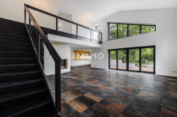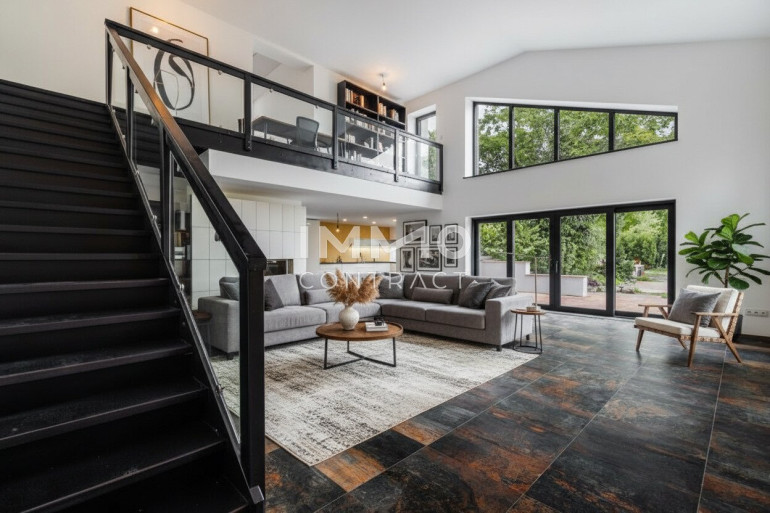 Auf rund 214 m² Wohnfläche entfaltet sich ein architektonisch prägnantes Wohnhaus mit großzügiger Raumwirkung und klarer Linienführung. Der offen gestaltete Wohn-Ess-Bereich mit überwiegend zweigeschossiger Raumhöhe (ca. 5m), Galerieebene und großflächigen Verglasungen bildet das repräsentative Zentrum des Hauses. Fließende Übergänge zu den Terrassenflächen erweitern den Wohnraum nach außen. Lichtführung, Blickachsen und Raumvolumen erzeugen ein außergewöhnlich freies und zugleich hochwertiges Wohngefühl.