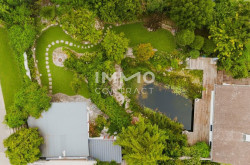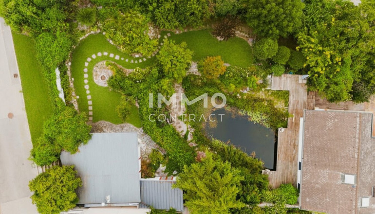 Ein besonderes Qualitätsmerkmal ist das Außenensemble: Mehrere Terrassenebenen mit insgesamt rund 155 m² Fläche, hochwertige Natursteinbereiche und sorgfältig platzierte Aufenthaltszonen schaffen differenzierte Freiräume über den gesamten Tagesverlauf. Der großzügige Schwimmteich mit Holzdeck und Wasserfallanlage bildet das visuelle und funktionale Zentrum des Gartens. Ergänzt wird die Anlage durch Bachlauf, Feuerstelle, Natursteinwege sowie gewachsenen Baum- und Strauchbestand — eine Gartenkomposition mit hoher gestalterischer und atmosphärischer Qualität. Abgerundet werden die Außenflächen mit Anschlüssen für Whirlpool und Sauna.