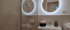 Das moderne Badezimmer ist mit einer bodengleichen Dusche ausgestattet und überzeugt durch klare Linien und hochwertige Materialien.