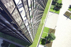 - Vollständig begrünte Plaza im Erdgeschoß