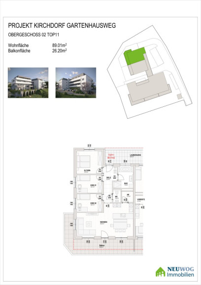 Die Immobilie befindet sich am Gartenhausweg in 4560 Kirchdorf an der Krems, einer Stadt in Oberösterreich. Sie liegt in einer ruhigen Gegend, in bester Zentrumslage in einer Sackgasse. Die 18 Wohneinheiten werden, im für die Fa. Neuwog üblichen, gehobenen Standard errichtet. NEUWOG steht für herzliche Betreuung und zufriedene Kunden!Beschreibung der Immobilie