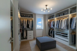 Die hochwertigen Materialien, wie Fliesen und Laminat, sowie die Fußbodenheizung, die von einer Luftwärmepumpe versorg wird, sorgen dafür, dass Sie sich in jedem Raum wohlfühlen.