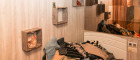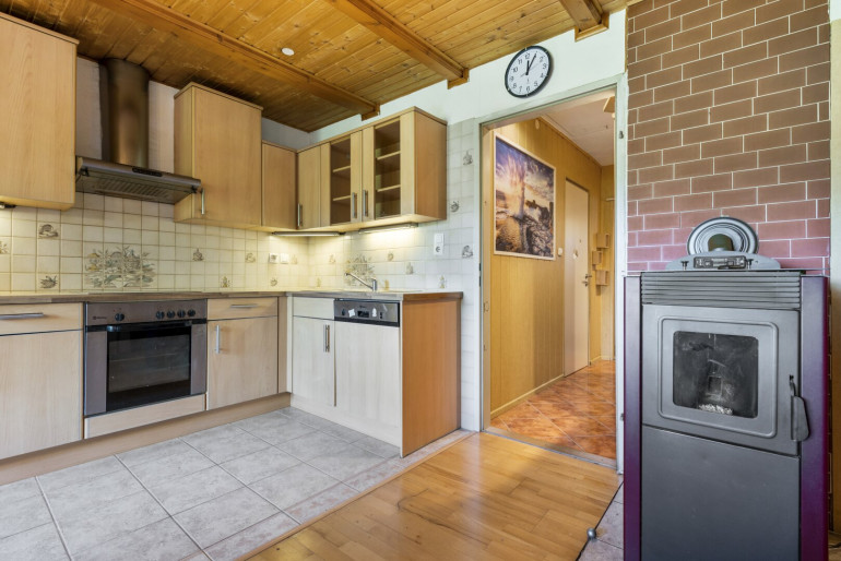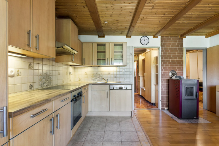 Im Küchen- und Essbereich ist ein Pelletsofen aufgestellt. Im Erdgeschoss befinden sich drei Zimmer. ImGangbereichist einAbstellkammerl, mit Waschmaschinenanschluss und das Badezimmer untergebracht.Das Badezimmer ist mit einer Badewanne mit Duschmöglichkeit, einem Waschbecken und einem WC, ausgestattet. Am Boden des Badezimmers und an den Wänden wurden Fliesen verlegt. Die Bodenbeläge im Wohnbereich und in den Zimmern sind aus Laminat. Im Küchenbereich ist der Fußboden ausFliesen.