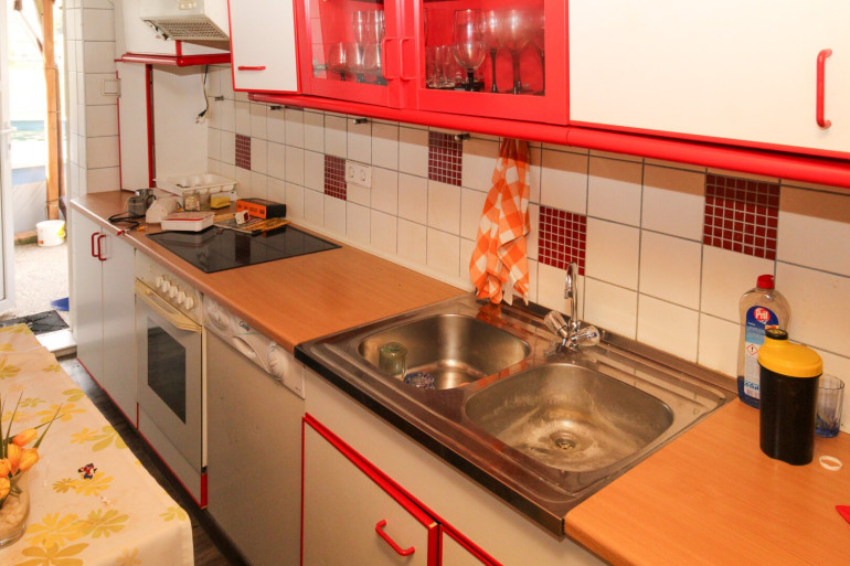 Fliesen, Laminatboden, Elektro, Heizofen, Wohnküche / offene Küche, Westbalkon, Bad mit Fenster, Badewanne, Parkplatz, Swimmingpool