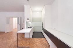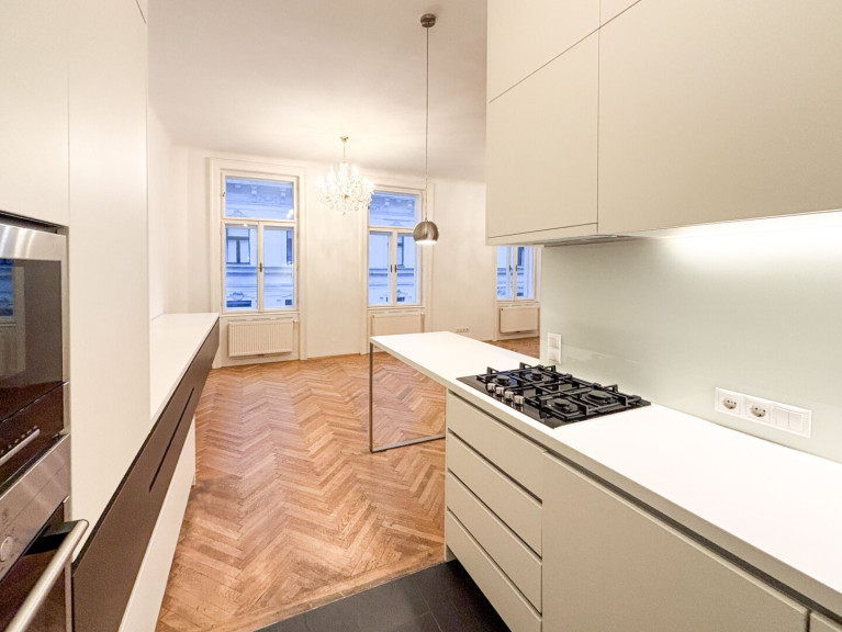 Das Büro bietet einen durchgehend verlegten Parkettboden, sämtliche Sanitärräume sind verfliest. Für typisches Altbauflair sorgen klassische Kastenfenster und Flügeltüren. Ein Highlight ist sicherlich die moderne Komplettküche mit verlängertem Stauraum in den Essbereich, welche mit Mikrowelle, Backofen, Geschirrspüler und Gasherd, Kühl- und Gefrierkombi ausgestattet ist. Geheizt wird mittels Gasetagenheizung. Die Raumhöhe beträgt 3,15 m.
