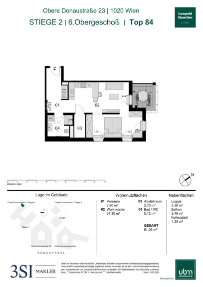 Diese moderne Wohnung befindet sich im 6. Obergeschoß. Die Einheit verfügt über eine Wohnnutzfläche von ca. 51 m² und bietet zusätzlich einen ca. 6 m² großen Balkon/Loggia.