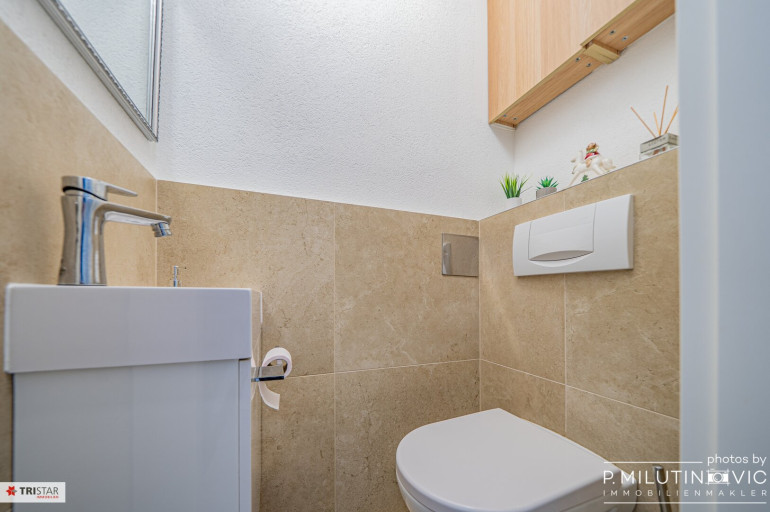 Edle Feinsteinfliesen in Vorraum, Küche, Bad und WC