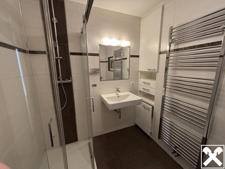 Sie besteht aus einem Wohnzimmer, zwei Schlafzimmern, einer Küche, einem Abstellraum sowie einem Badezimmer mit Dusche und einer kleinen Badewanne. Ein Balkon ist vorhanden. Ein großes Kellerabteil sowie ein Freistellplatz sind ebenfalls inkludiert.