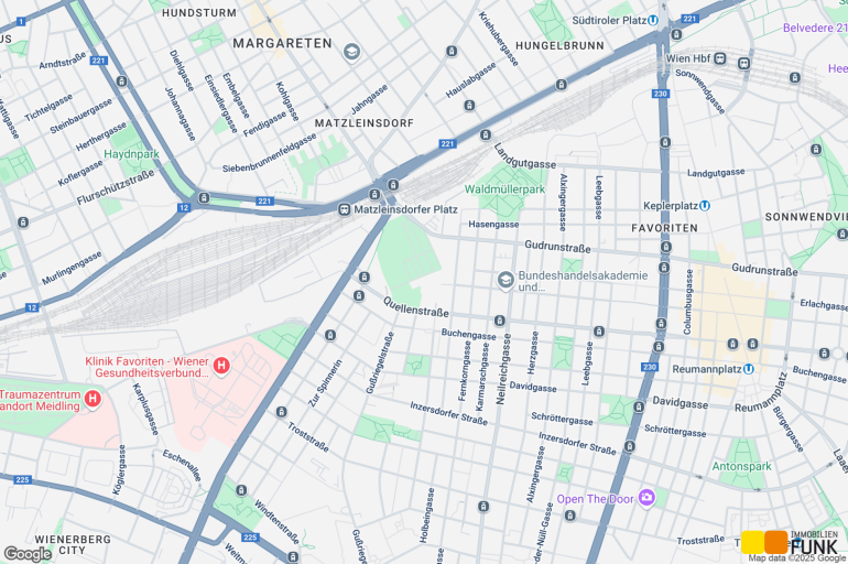 Zur Vermietung gelangt eine Wohnung im 10. Wiener Gemeindebezirk, nahe dem Matzleinsdorfer Platz. Das Wohnhaus grenzt direkt an den Waldmüllerpark an. Geschäfte des täglichen Bedarfs (Penny und Hofer) erreichen Sie in nur etwa 5 Gehminuten. Die Anbindung an das öffentliche Verkehrsnetz ist durch die Nähe zum Bahnhof Matzleinsdorfer Platz hervorragend gegeben. Innerhalb von etwa 7 Gehminuten oder einer Station mit dem Bus 14A , von der Haltestelle Sonnleithnergasse, gelangen Sie zu den Zuglinien S1, S2, S3 und S4, und den Straßenbahnlinien 1, 6, 18, 62 und der Badner Bahn. Zusätzlich ist bis Ende 2030 die Fertigstellung der U-Bahn-Station Matzleinsdorfer Platz (Linie U2) geplant.