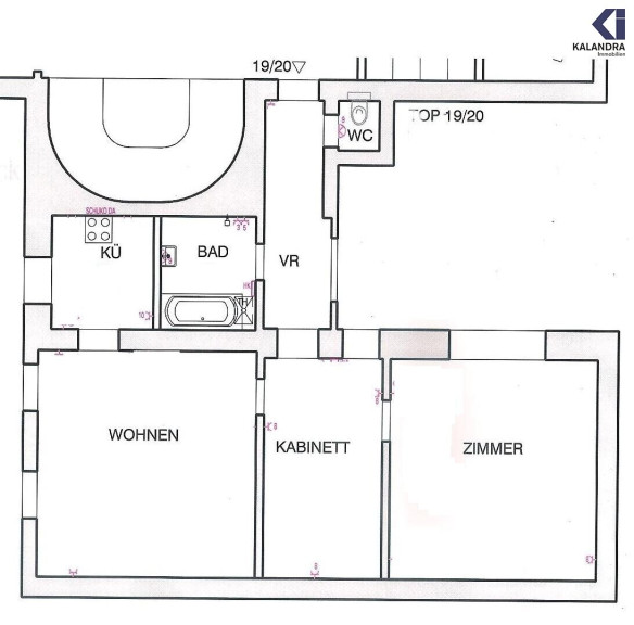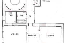 Vorzimmer, Wohnzimmer, separate Küche, Arbeits- oder Esszimmer (Durchgangszimmer), Schlafzimmer, Wannenbadbad, separates WC.