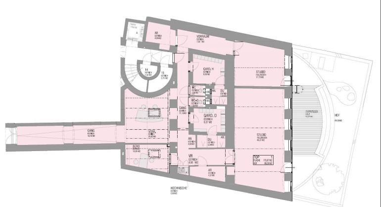 Das gesamte Studio erstreckt sich auf einer Fläche von ca. 176 m² und bietet darüber hinaus eine Außenfläche von zusätzlich 19,91 m² Hof-Terrrasse und ca. 89,26 m² Innenhofbereich.