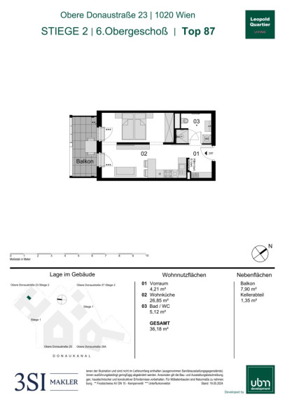 Diese moderne Wohnung befindet sich im 6. Obergeschoß. Die Einheit verfügt über eine Wohnnutzfläche von ca. 36 m² und bietet zusätzlich einen ca. 8 m² großen Balkon.