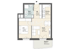 Das Herzstück der Wohnung bildet die helle Wohnküche mit optisch abgetrenntem Kochbereich. Von hier aus gelangen Sie direkt auf den sonnigen Südbalkon, der mit einer schönen Aussicht zum Entspannen und Genießen einlädt. Auch das Schlafzimmer ist nach Süden ausgerichtet und profitiert von viel Tageslicht.