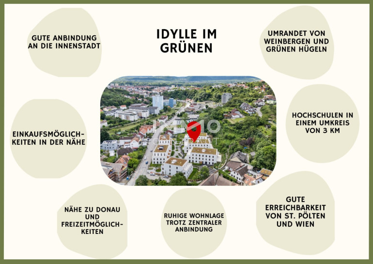 - Urbaner Komfort trifft grüne Idylle - Diese exklusive Neubauwohnung liegt in einer begehrten Wohnlage von Krems an der Donau – ruhig gelegen, umgeben von grünen Weinbergen und dennoch nur wenige Minuten von der lebendigen Kremser Innenstadt entfernt. Hier genießen Sie das Beste aus zwei Welten: Natur, Ruhe und Ausblick auf der einen Seite – urbanes Leben, Infrastruktur und kurze Wege auf der anderen. Spaziergänge durch die Weinlandschaft, sportliche Aktivitäten im Grünen oder ein spontaner Stadtbummel lassen sich hier mühelos kombinieren. Die Nähe zu Nahversorgern, Bildungseinrichtungen und medizinischer Versorgung garantiert höchsten Alltagskomfort. Schulen, Kindergarten und Universität sind ebenso rasch erreichbar wie Supermärkte, Bäckereien und Apotheken. Auch verkehrstechnisch überzeugt die Lage: Der Bahnhof Krems, der Autobahnanschluss sowie die gute Erreichbarkeit nach St. Pölten und Wien machen diese Wohnung ideal für Pendler ebenso wie für alle, die stadtnah wohnen und dennoch ruhig leben möchten. Eine Lage, die nicht nur heute überzeugt – sondern auch langfristig Lebensqualität und Wertbeständigkeit verspricht.Beschreibung der Immobilie