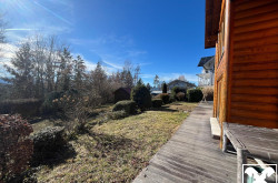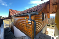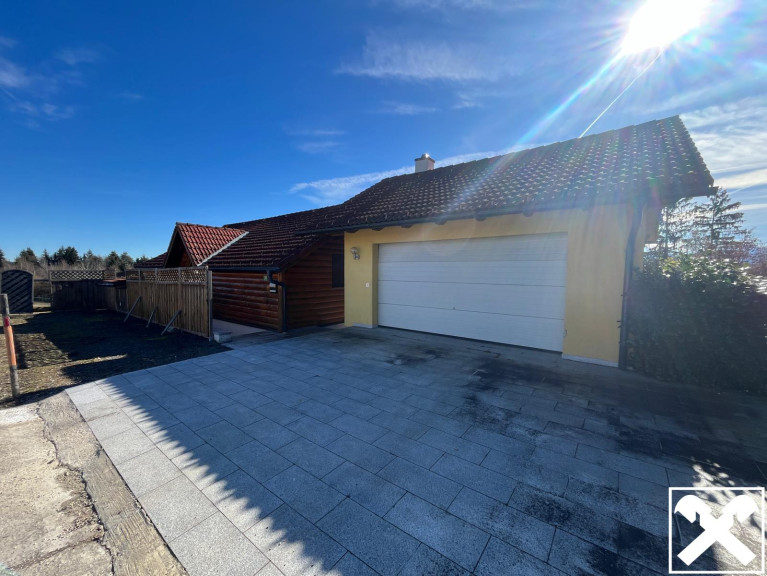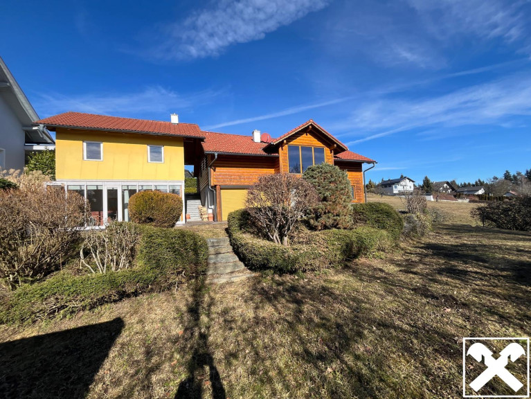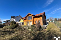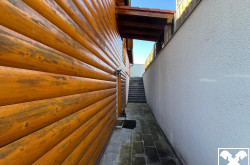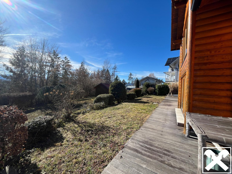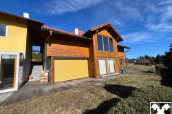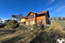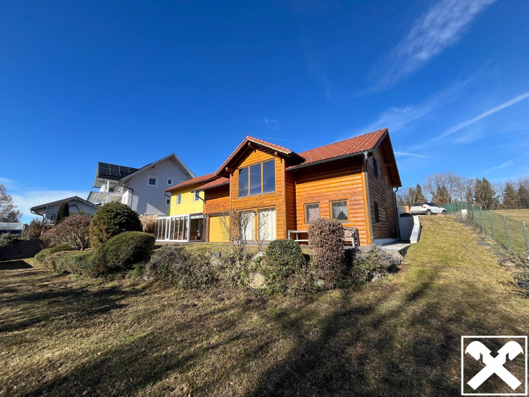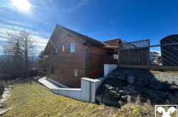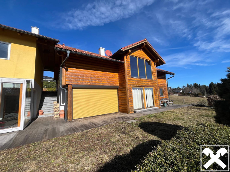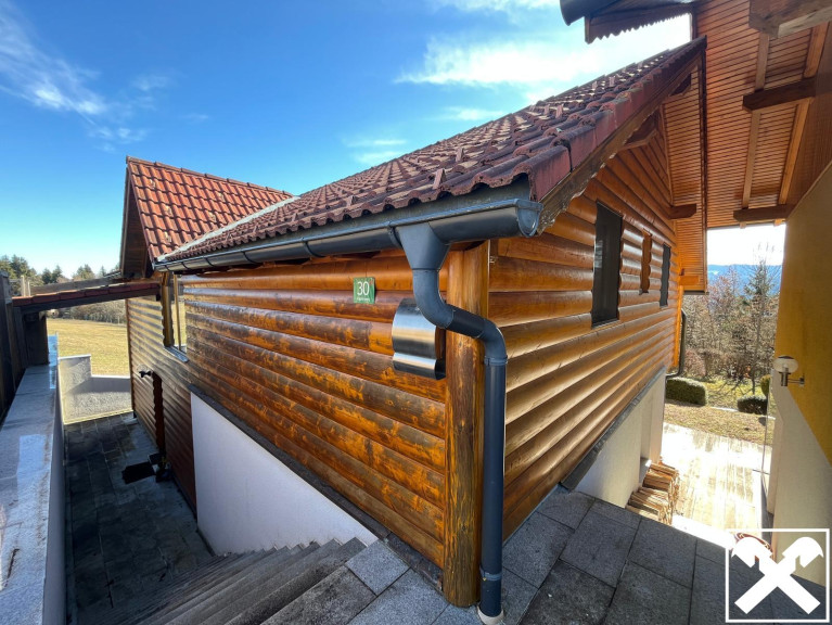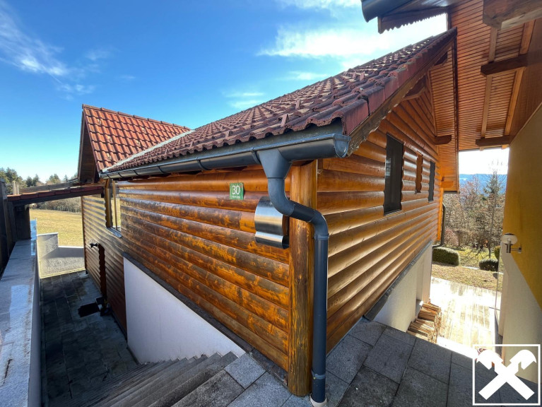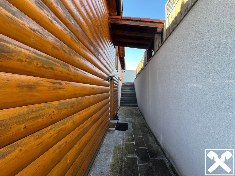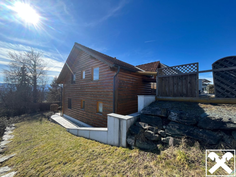 Dieses stilvolle Wohnhaus in massiver Blockbalkenbauweise überzeugt durch hochwertige Materialien, moderne Technik und eine durchdachte Raumaufteilung. Der Zugang erfolgt über eine Außentreppe mit Natursteinbelag.