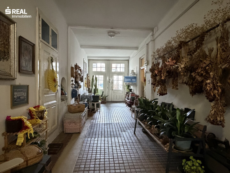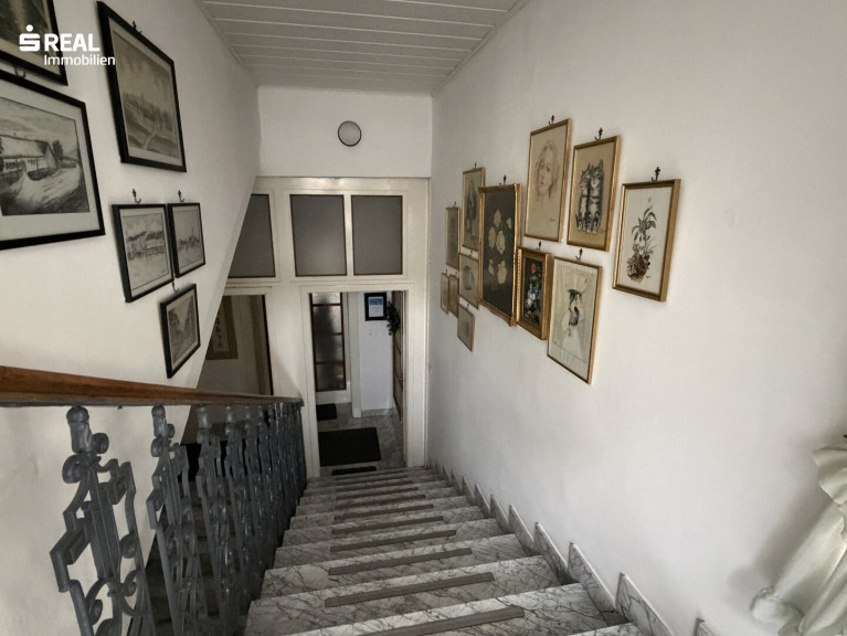 Bereits beim Betreten des Gebäudes wird der besondere Charakter spürbar: der großzügig gestaltete Eingangsbereich mit seinen historischen Fliesen, hohen Türen und der gewachsenen Struktur vermittelt ein repräsentatives Ambiente. Das Stiegenhaus mit breiten Stein-Stufen, schmiedeeisernem Geländer und Originaltüren unterstreicht die Geschichte des Hauses und verleiht der Liegenschaft eine besondere Wertigkeit.
