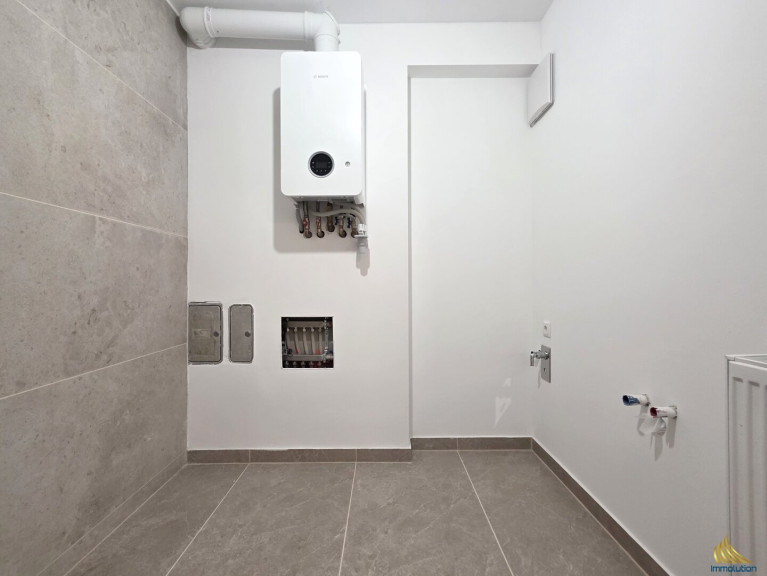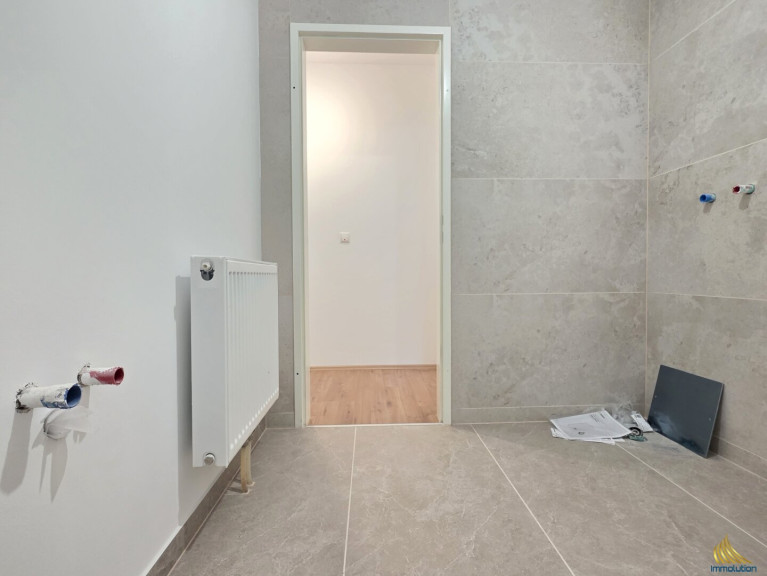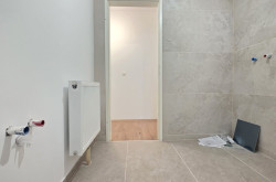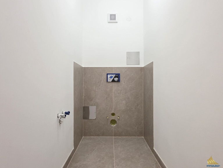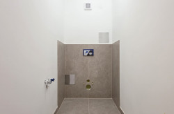 - Badezimmer mit Dusche, Handwaschbecken, Waschmaschinenanschluss, Lüftung