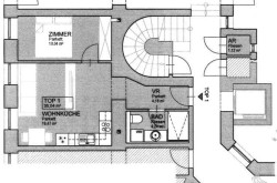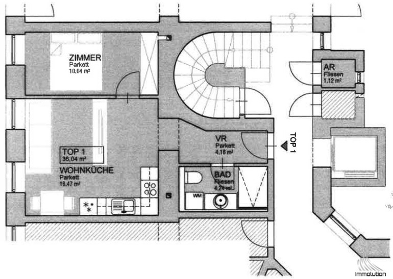 Die Wohnung liegt im Erdgeschoss und ist barrierefrei erreichbar. Auf ca. 35 m² sorgt die beeindruckende Raumhöhe von rund 3,15 m für ein großzügiges Wohngefühl. Zusätzlich gehören ein Kellerabteil (ca. 2,2 m²) und ein Abstellraum am Gang (ca. 1,1 m²) zur Wohnung.