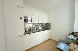 Die kompakte Küche ist funktional integriert und unterstützt einen professionellen Arbeitsalltag ohne Flächenverlust.