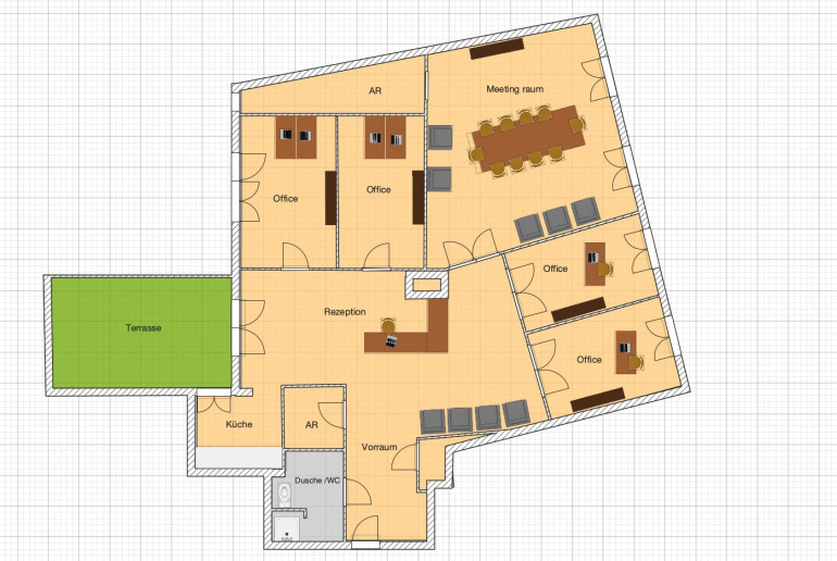 Eine klare Empfangssituation mit möglicher Rezeption, separate Besprechungsräume sowie großzügige Arbeitsbereiche lassen sich effizient realisieren.